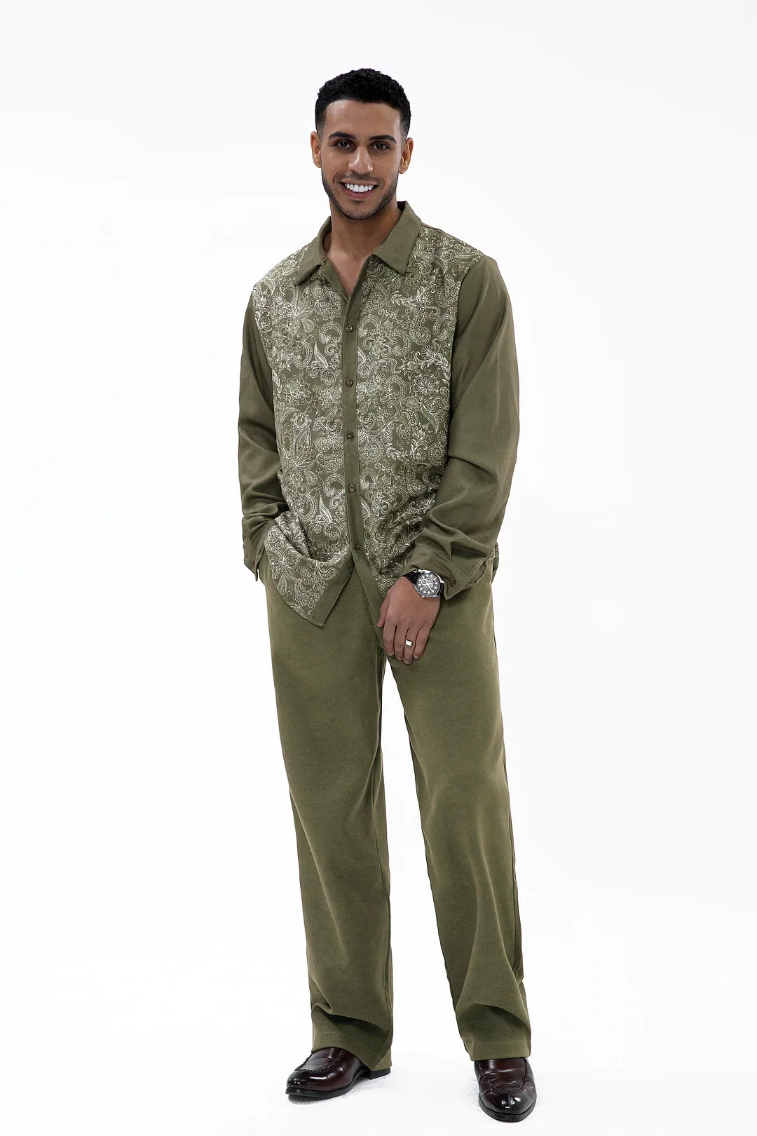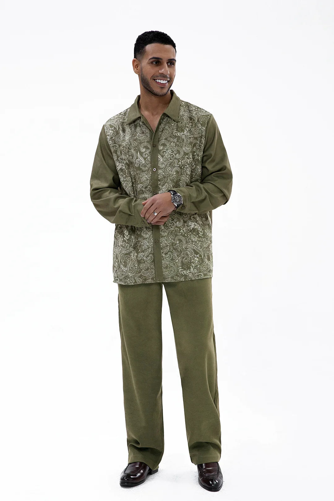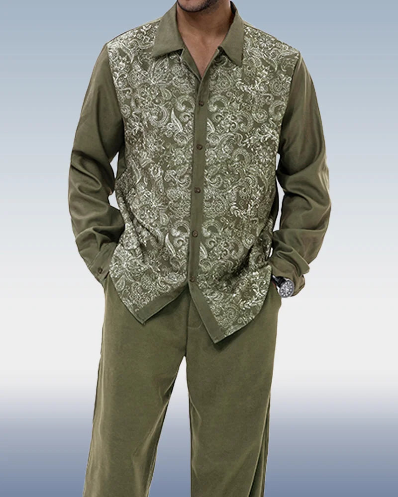 Long Sleeve Trousers Green Cashew Blossom Two-Piece Walking Set