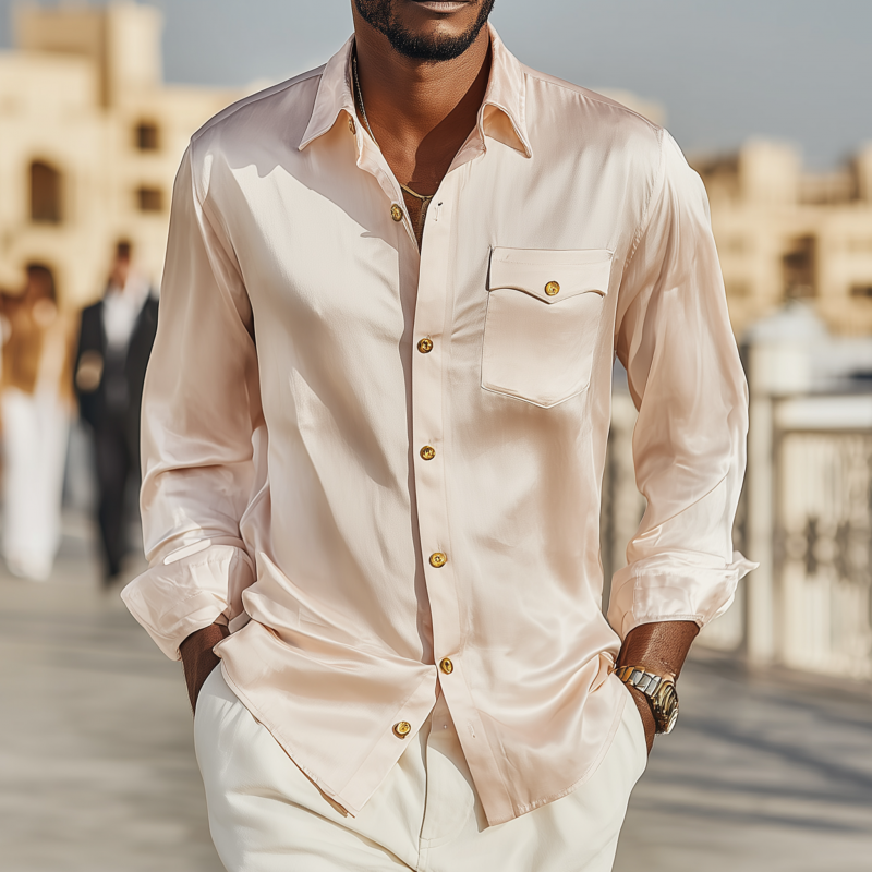 Leroy | Men'S Vintage Elegant Solid Satin Lapel Chest Pocket Slim Fit Long Sleeve Shirt
